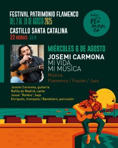 Josemi Carmona estará en concierto en el FESTIVAL PATRIMONIO FLAMENCO de Cádiz con su espectáculo «Mi vida, mi música» , toda una inmersión en sus raíces flamencas. El concierto tendrá el miércoles 6 de agosto, a las 22:00h en el CASTILLO DE SANTA CATALINA. El precio de la entrada es de 15€.