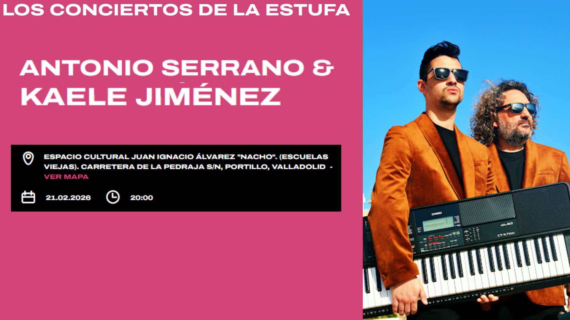 Antonio Serrano, y Kaele Jiménez estarán en concierto en el Espacio Cultural Juan Ignacio Álvarez "Nacho", en Portillo, Valladolid, dentro del marco de LOS CONCIERTOS DE LA ESTUFA. El concierto tendrá lugar el próximo sábado 21 de febrero, a las 20:00h. Y El precio de la entrada es desde 15€.  COMPRAR ENTRADAS: