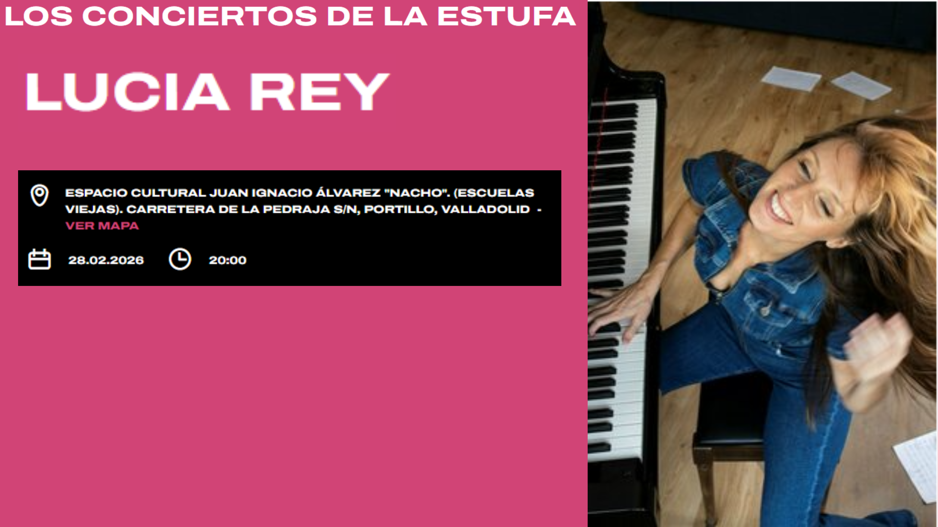Lucía Rey estará en concierto en estará en concierto en el Espacio Cultural Juan Ignacio Álvarez "Nacho", en Portillo, Valladolid, dentro del marco de LOS CONCIERTOS DE LA ESTUFA. El concierto tendrá lugar el próximo sábado 28 de febrero, a las 20:00h. Y El precio de la entrada es desde 15€ COMPRAR ENTRADAS