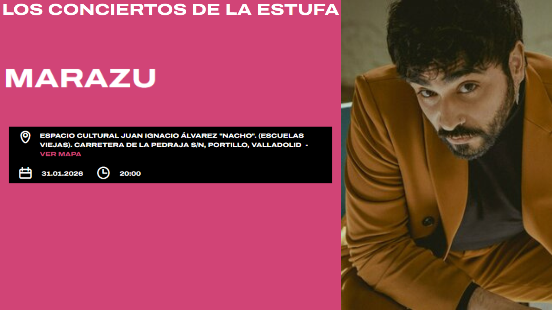 El próximo sábado 31 de enero, a las 20:00, Marazu estará en concierto en el Espacio Cultural Juan Ignacio Álvarez "Nacho", en Portillo, Valladolid, dentro del marco de LOS CONCIERTOS DE LA ESTUFA. El precio de la entrada es desde 15€ COMPRAR ENTRADAS